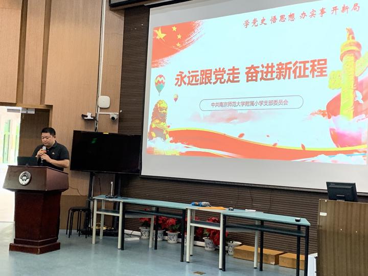 7月12日下午,南师附小党支部组织全体党员老师在四牌楼阶梯教室召开专题学习会议,共同学习以“永远跟党走,奋进新征程”为主题的党课。此次党课由党支部书记李昌亮书记主持。