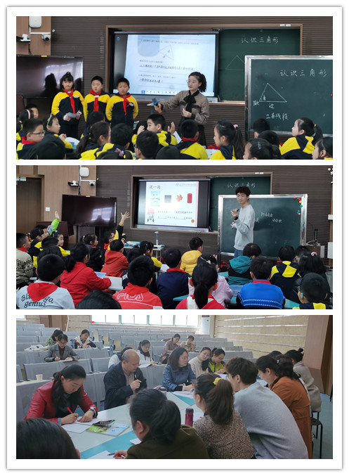 首先,周红霞老师和四(6)班的孩子为大家带来了《认识三角形》一课。周老师整节课以小研究为脚手架,通过对几个核心问题的合作研究,启发学生通过比较等手段找到三角形的特征、理解什么是三角形、什么是三角形的高等概念,并在交流中抓住学生的生成性资源,逐步解决怎样画三角形的高等操作性问题。整节课流畅自然,循序渐进,学生的交流得到了充分的发挥与反馈。