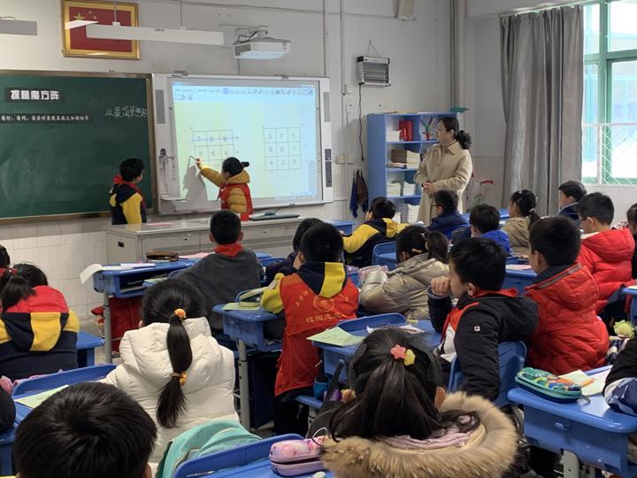 首 先,提秀雷老师带来了一节四年级的拓展课《探秘魔方阵》。提老师从“5×5”的魔方阵视频引入,启发学生面对复杂的问题时可以从最简单的情况入手,把复杂 问题简单化,逐步探索出魔方阵中数字摆放的位置和出现次数之间的联系,最终确定数字的位置。面对课堂上学生所呈现的思路,提老师适时点拨、及时总结,孩子 们对魔方阵的认识得到了进一步的发展和提升。课堂上学生思维活跃,积极参与,孩子们的精彩交流也给大家留下了深刻的印象。