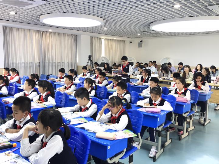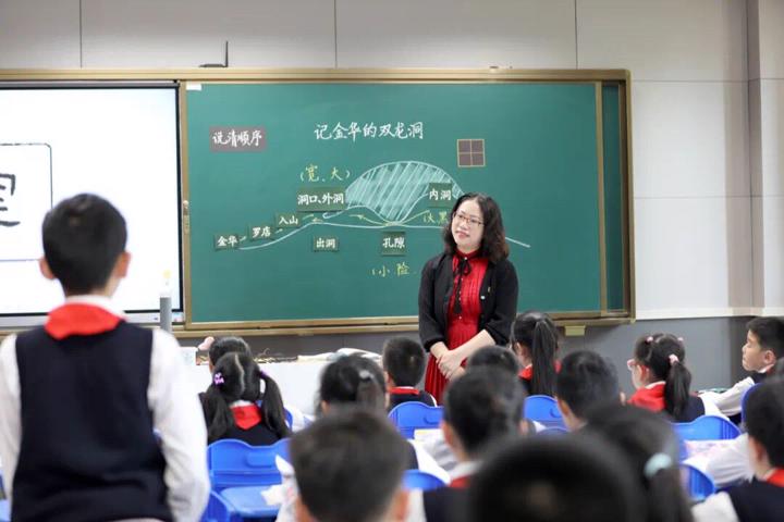 在 四楼录播室,袁媛老师带来《记金华的双龙洞》的精彩课例展示。袁老师结合游记文本的特点,引导学生整体把握作者游览顺序,进而探究写法,实现语言的迁移和 运用。学生沉浸在情境中,课堂上师生互动、生生互动氛围融洽。崔璨老师由看图猜字引出“矛”和“盾”,遵循学生理解文言文的学习规律,引导学生读懂、读好 《自相矛盾》,探究人物思维过程并与真实生活链接。张梦清老师执教《真理诞生于一百个问号之后》,小组合作开放有效,小研究学习贯穿始终,引导孩子自主合 作探究。
