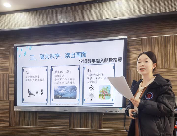 然后袁倩妍老师开展《童年的水墨画》说课,本课是一首儿童组诗,教学中重在引导儿童想象画面,用多种方法理解难懂的句子。据此,杨院长指出诗歌教学要加强对儿童朗读诗歌的指导,设计三次朗读,从读通诗歌到读出诗歌画面,最后再引导儿童读出诗歌情节的变化。