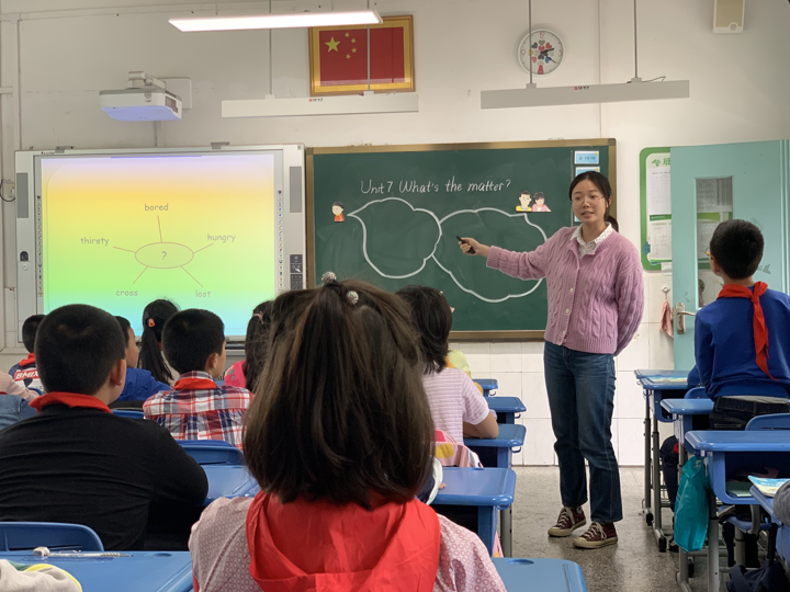 首 先由吴沛彦老师执教四年级Unit7 What’s the matter? Story time板块。吴老师由学生们已知的绘本 “The Journey”导入,让孩子们通过“brainstorm”的方式进一步学习了有关“感觉(feelings)”的词语,给予了孩子充分的自 主学习空间。在拓展提升环节,吴老师基于文本,结合旧知,创设了“Taotao’s Day”,引导孩子在说一说、演一演中感受Liu Tao的情绪变 化,通过聚焦不同情境下的打招呼方式,让孩子初步树立“得体交流”的意识。