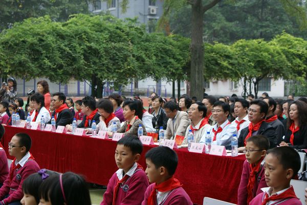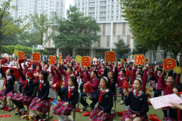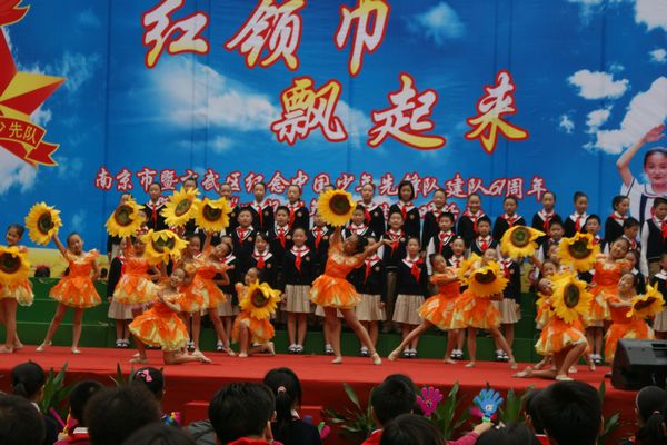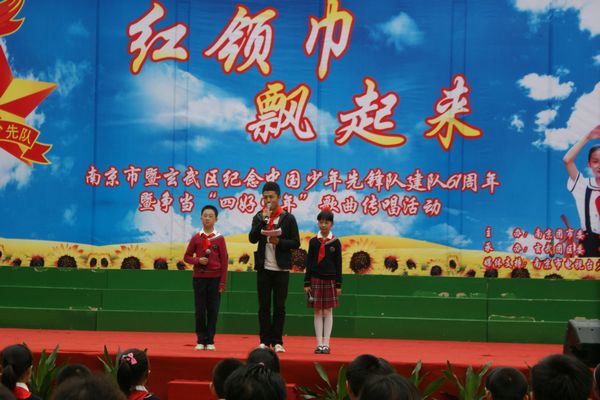 10月12日下午,南京师范大学附属小学鼓声阵阵,队旗飘扬,南京市暨玄武区纪念中国少年先锋队建队61周年暨争当“四好少年”歌曲传唱活动在这里举行。活动现场,歌如潮,花如海,掌声雷动,来自全市近1000名少先队员代表用最美丽的装扮,最饱满的热情,以表演唱、合唱、拉歌等形式唱响争当“四好少年”歌曲,抒发争当“四好少年”的豪情。市少工委主任、团市委副书记郑玲玲,市教育局副局长周文海等领导出席了活动,玄武区委副书记张萍,玄武区委常委、区政协副主席、统战部部长刘显平等领导来到活动现场,与少先队员一起欢度建队节。