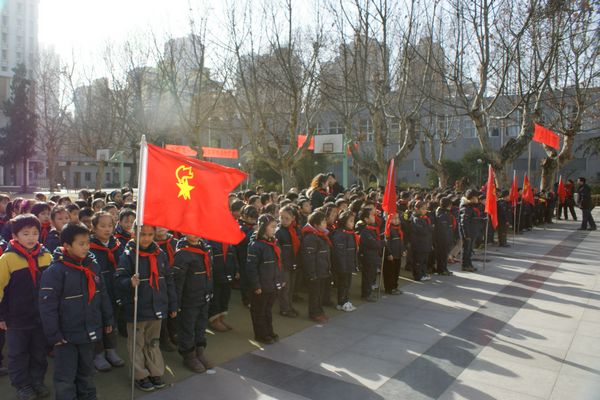 在大队旗的见证下,老队员为新队员佩戴上了少先队员标志——红领巾。“当大哥哥、大姐姐为员我们带上鲜艳的红领巾时,我非常激动和自豪,从今天起我已经不是一名普通的小学生了,而是一名光荣 的少先队员……”一条条鲜艳的红领巾让新队员们激动不已。一句句庄严的誓词,一声声响亮的呼号,展示着少先队员的光荣感和自豪感,也展现了新时代少年儿童积极向上的精神面貌。