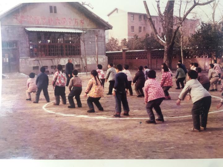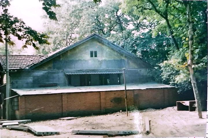 整个建筑都是木质的或木板装饰的,咖啡色,礼堂后台连着托儿所,周围有些松树,让环境一下子就静下来了。当时,礼堂面积算比较大,全校师生都在此集会。