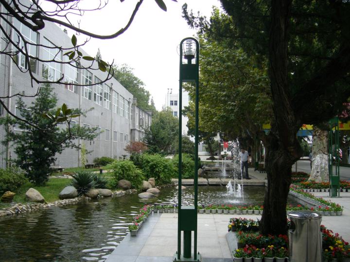 “灵韵溪”的设计综合考虑场地原有条件、建筑采光,以水景,绿化为主, 设计中水景以“叠水景墙”的形式,动静结合,活跃了空间气氛,增加了空间的连贯性和趣味性。在设置水景时考虑学生观赏,在水景中设置汀步,水景旁设置林荫小道,水景与林荫小道的静谧氛围相融合,别有一番风味。